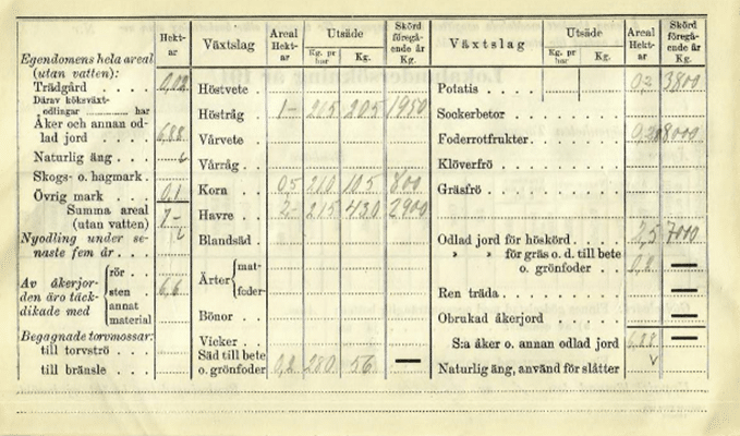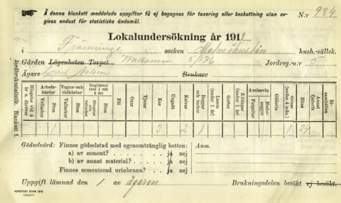 ‘Vid lokalundersökningen av jordbruket 1919 redovisade Karl Nilsson fastigheten Vallarum 5:3 om 5/176 mantal och som omfattade 7 hektar mark totalt, varav 6,88 hektar var åkermark. Man skulle uppge vilka djur som fanns på gården vid undersökningstillfället och hos Karl och Eva fanns det 24 höns, 1 smågris, e tacka eller bagge, 3 kor och 2 kalvar. På gården fanns även en arbetshäst. Man skulle även redovisa vad man odlat året innan, 1918, och vilka skördar man fått. På denna gård hade man odlat höstråg 1,95 ton, korn 0,8 ton, havre 2,9 ton, potatis 3,8 ton och foderrotfrukter 8,0 ton. Man hade även odlat 2,5 hektar mark för höskörd och erhållit 7 ton hö.